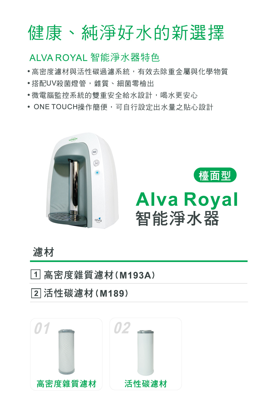 德國福維克集團 將最純淨的飲水帶到您家全球首創有自動監控的 Alva Royal Pure Water 設計理念 淨化自來水、達到無化學污染、無菌、保留礦物質的健康飲水標準 符合W H O國際世界衛生組織及中華民國行政院環保署飲用水標準 多用途淨水器系列 一、獨創專利高密度濾材及高壓活性碳磚濾淨系統-過濾水中塑化微粒、吸附有機化學毒素並保留適當水中礦物質(鋅、鎂、鈣、鐵錳等)微量元素小分子可被人體吸收 二、UV殺菌照射強度58920µ/cm平方(專利螺旋水流設計)有效殺菌率99.99%以上、微電腦監控系統(電磁閥控制保證安全情況下出水)、抑菌功能、出水口短無二次污染提供新鮮無菌健康飲用水 三、UV殺菌燈、慮材自動監控自動斷電、斷水,安全有保障,殺菌系統15分鐘自動斷電節能,省電環保延長殺菌燈壽命 四、SGS檢測PH7.5-8.0最適合人體弱鹼性飲水幫助對抗酸性體質 五、長達40年的服務口碑遍布全省的服務網,主動提供滿意、便利的後服務ㄧ通電話服務到家