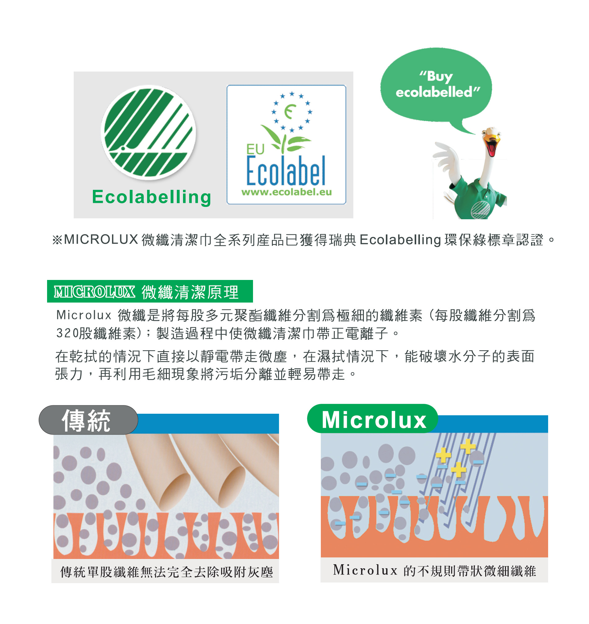 Microlux用途廣泛且能大量減少化學清潔劑的使用,是符合環保的綠色產品,使清潔的工作快速、有效又輕鬆。